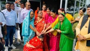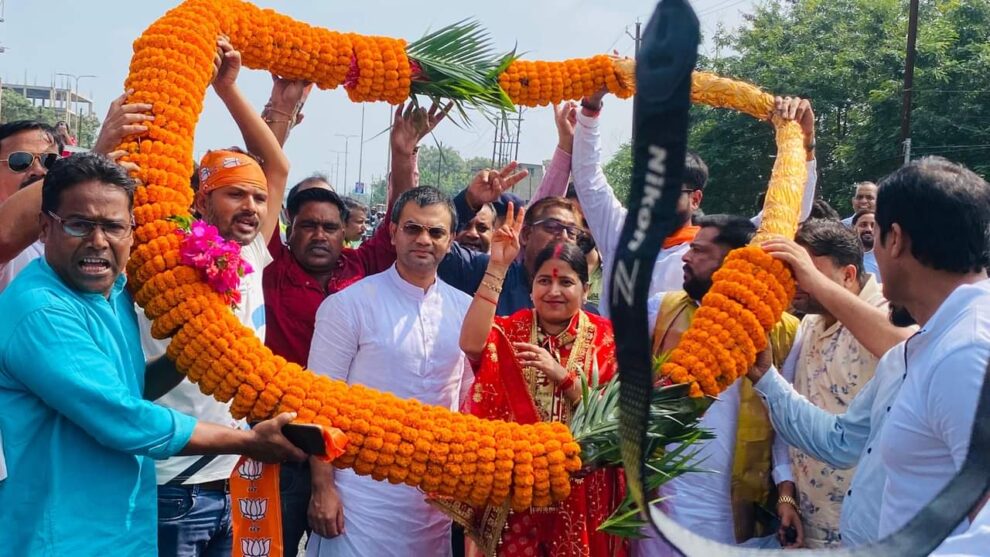 हजारों समर्थक के साथ पहुंची नामांकन करने पेलोडर पर चढ़कर हुई फूल की वर्षा,