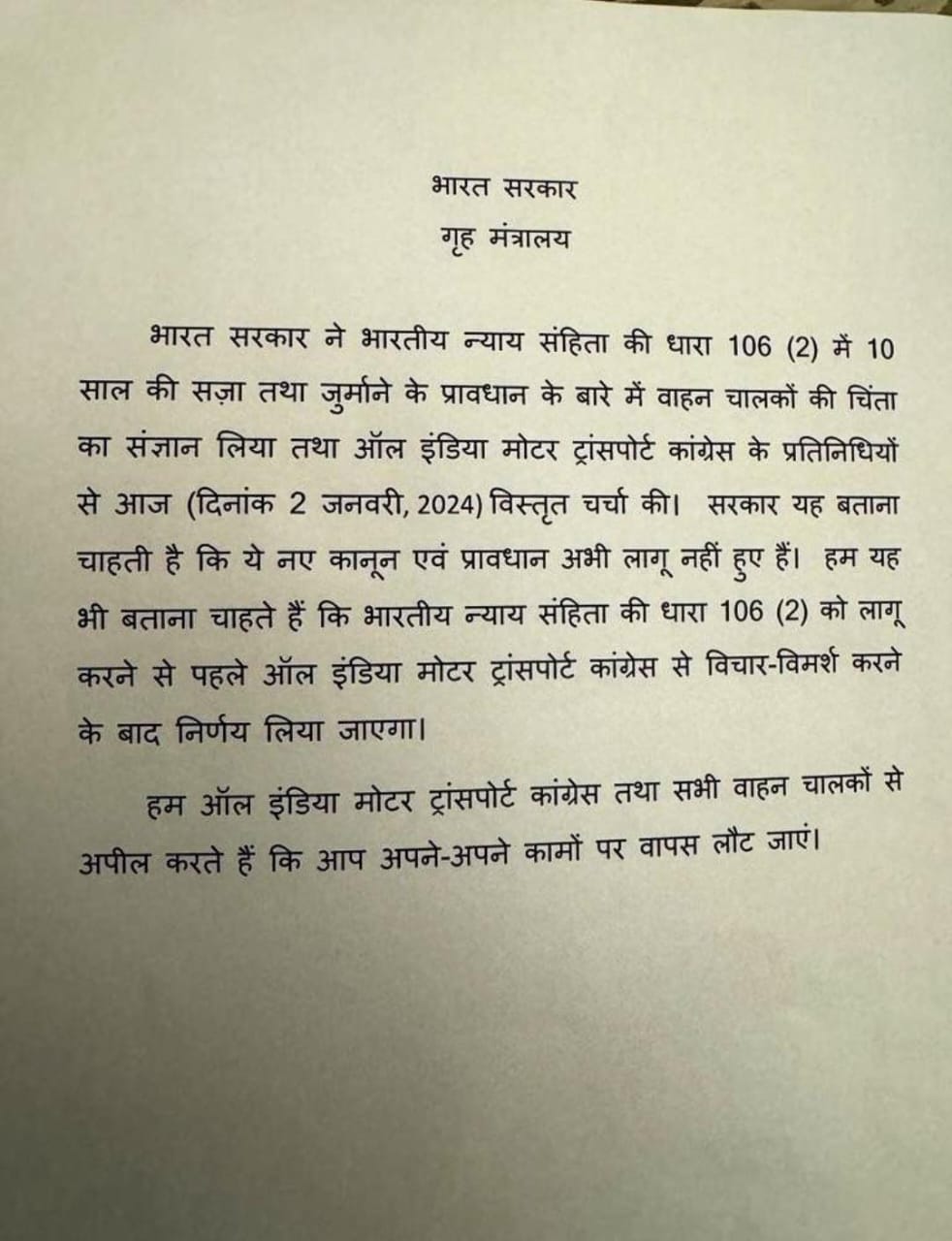 बिग ब्रेकिंग-केंद्रीय गॄह सचिव अजय भल्ला के साथ ऑल इंडिया मोटर ट्रांसपोर्ट कांग्रेस के पदाधिकारियों की बैठक खत्म,बैठक के बाद यूनियन के पदाधिकारियों ने कहा कि बैठक में जो मुद्दे रखे गए थे वो सरकार ने मान लिए हैं,गृहमंत्री अमित शाह के कार्यलय की तरफ से आश्वासन दिया गया है कि नया कानून लागू करने से पहले यूनियन से बातचीत की जाएगी,यूनियन के पदाधिकारियों ने ट्रक ड्राइवर भाइयों को कहा कि हमने आपकी चिंता 28 दिसंबर को ही सरकार तक पहुंचा दी थी,और हम आपको यह आश्वासन देते हैं कि नया कानून लागू नही होने दिया जाएगा,यूनियन ने सभी ड्राइवरों से काम पर लौट आने की अपील भी की,उन्होंने कहा कि नया कानून अभी लागू नही है,इसलिए आप बिना किसी चिंता अपना काम करें